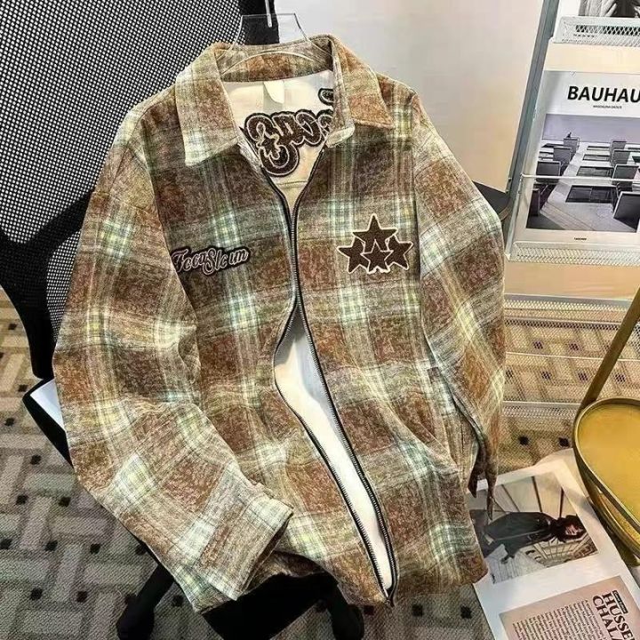 全清13.8美式vibe刺绣格子夹克男女同款春秋季宽松外套潮牌复古痞帅情侣衣服...