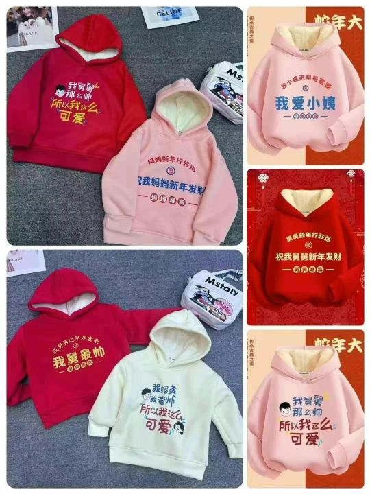 全清5.5元,儿童红色加绒加厚连帽卫衣中国风男童女童冬季加厚后颈包边包条...