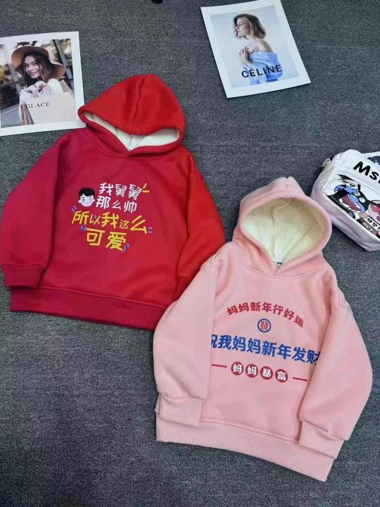 全清5.5元,儿童红色加绒加厚连帽卫衣中国风男童女童冬季加厚后颈包边包条...