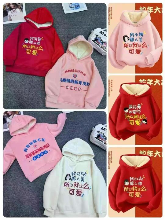 全清5.5元,儿童红色加绒加厚连帽卫衣中国风男童女童冬季加厚后颈包边包条...