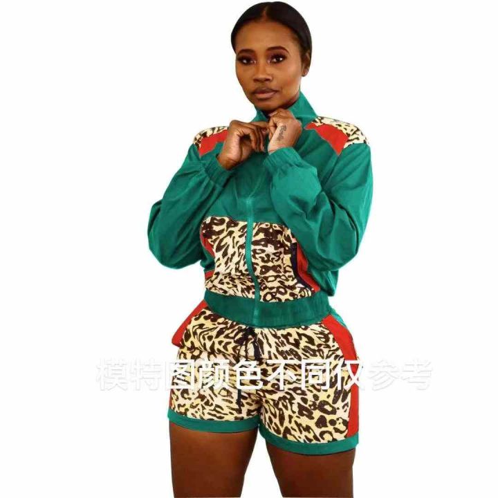 6.8清欧美性感豹纹撞色拼接运动开衫两件套,整款两色,两侧拉链口袋设计,...