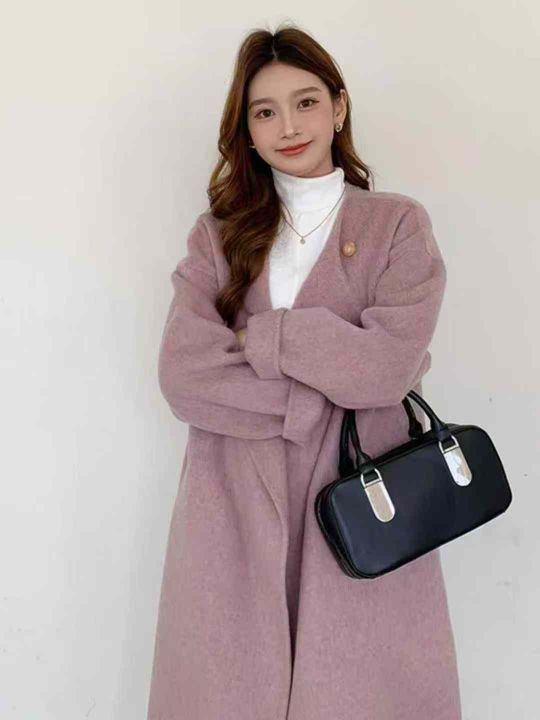 91件秋冬韩系高级粉色毛呢时尚中长款法式复古毛呢外套,单款单色,码数S—X...
