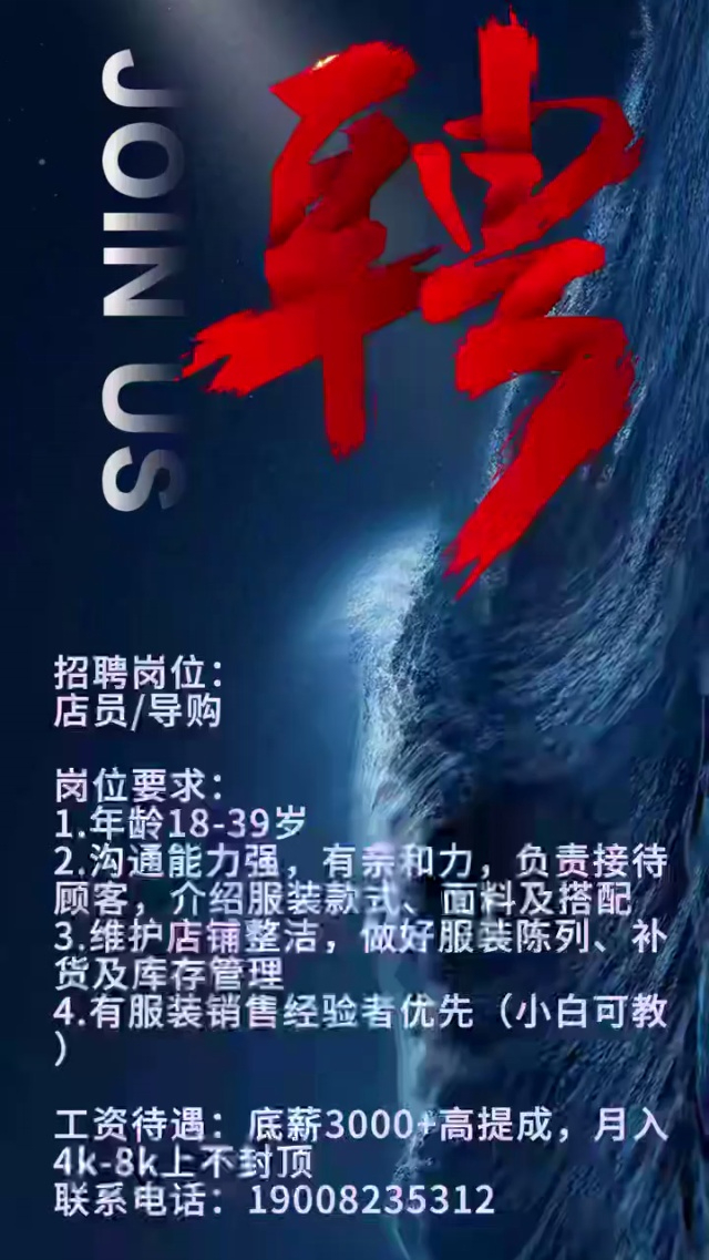 招女服装销售一名工作地址德阳上美广场负一楼,底薪3200加提成月休四天有空...