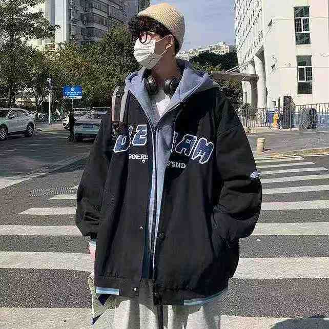 全清38.8元/件,100件起批1000件高品质男女同款假两件套连帽加厚棉服,独立...