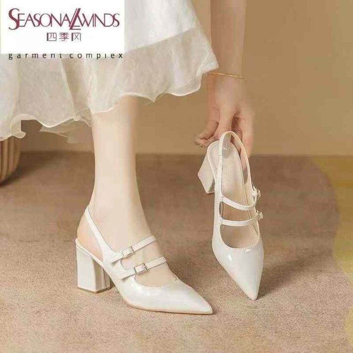 爆款网红外穿时尚复古女鞋裸色尖头秋季漆皮后空气质单粗高跟夏凉,有部份没...