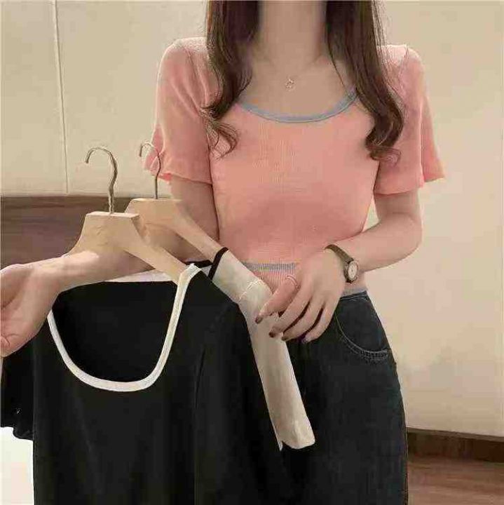 夏季新款高弹力方领木耳边法式奶系温柔风针织短袖T桖,独立包装,均码面料...