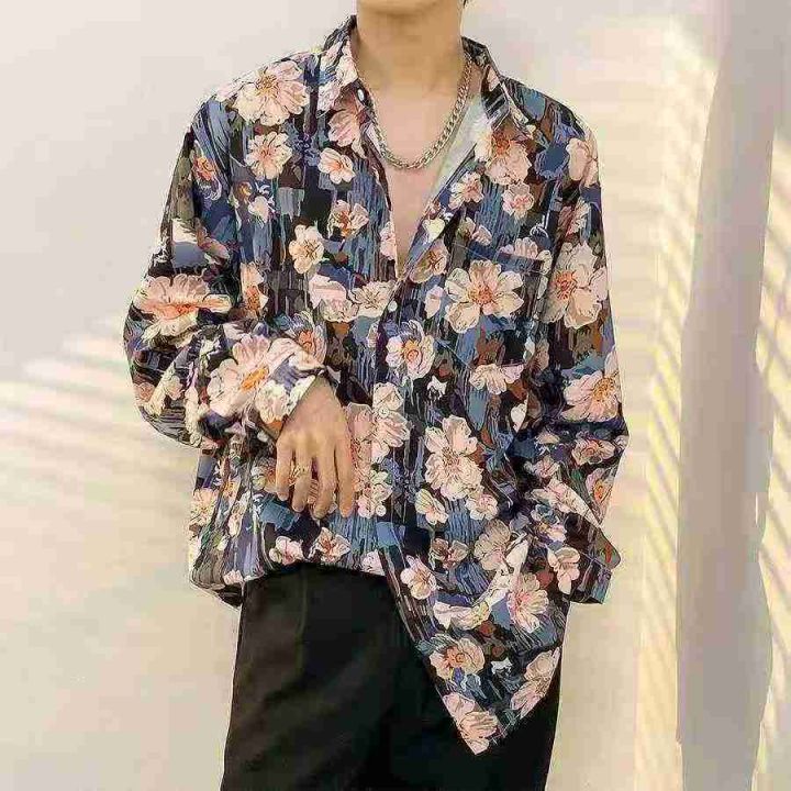 港风古着花衬衫男女复古痞帅百搭宽松设计感小众长袖衬衣,独立包装,码数S-...