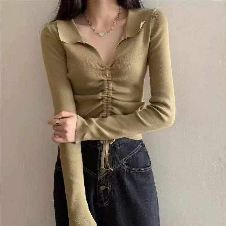 秋季新款韩版复古网红抽绳绑带设计款Polo领长袖针织套头毛衣,独立包装,均...