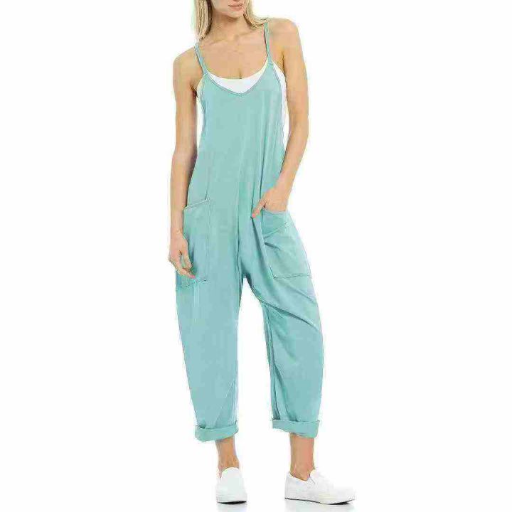欧美大码V领胖MM浅绿色口袋宽松休闲吊带连体裤,独立包装,700件,S-2XL,...