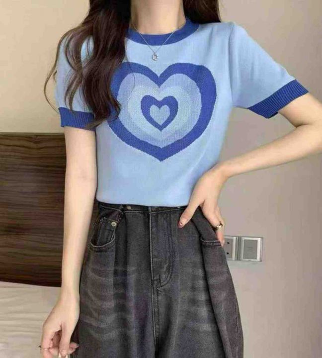 捡漏款,夏季新款正肩甜酷撞色设计感爱心提花弹力修身显瘦针织短袖,独立包...