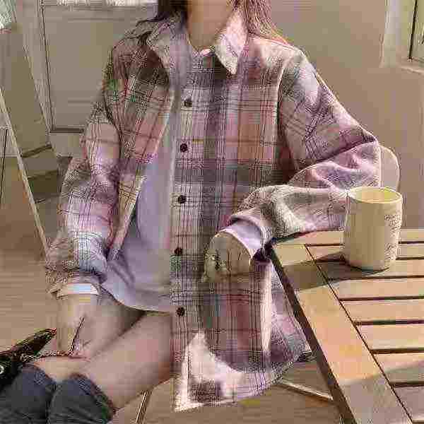 港风复古格子长袖衬衫季设计感宽松衬衣外套,1到4码,图片款,图片色,独立...