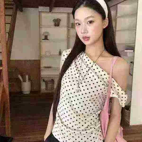 上新全清:7.8一件复古甜美波点斜肩修身辣妹上衣,[爱心]95件左右,蓝色为...