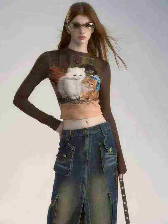 猫咪印花高级感辣妹上衣154件6.8,金丝绒拼接棉袖子,高弹力,手感舒适,修...