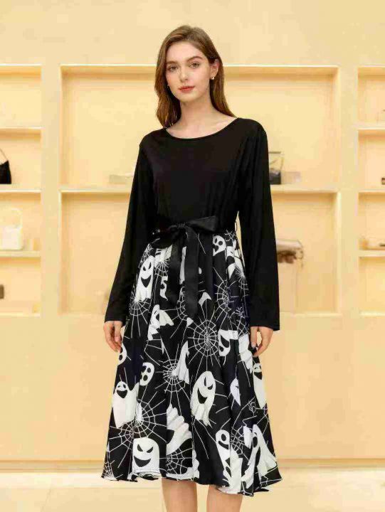 跨境电商赫本复古万圣节印花长袖大摆连衣裙送丝带,独立拉链包装,410件,X...