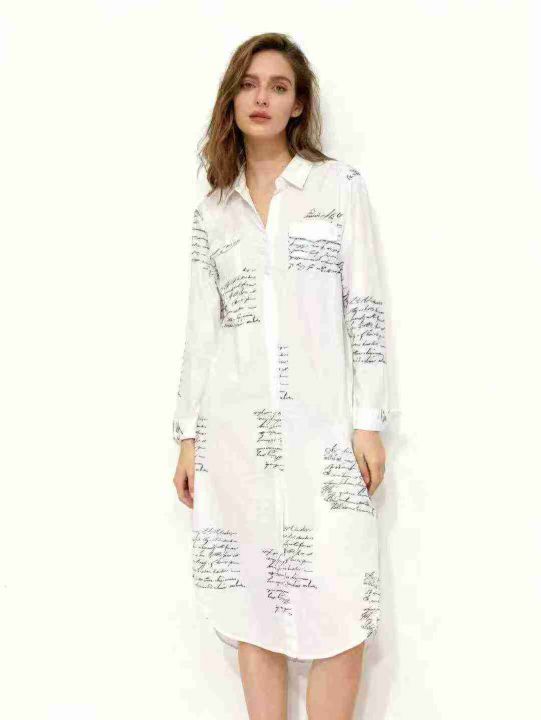 春季新款时尚气质速卖欧美印花纽扣衬衫长袖气质连衣裙,独立拉链包装,S-2X...