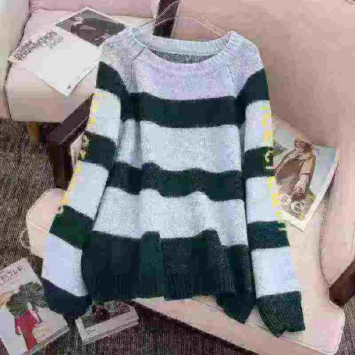 女装秋冬款复古撞色条纹ins港风大版厚重宽松毛衣针织衫上衣,独立包装,均...