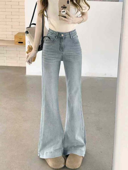 秋季新品弹力洗水棉辣妹风复古水蓝色修身显瘦百搭喇叭牛仔长裤,独立包装带...