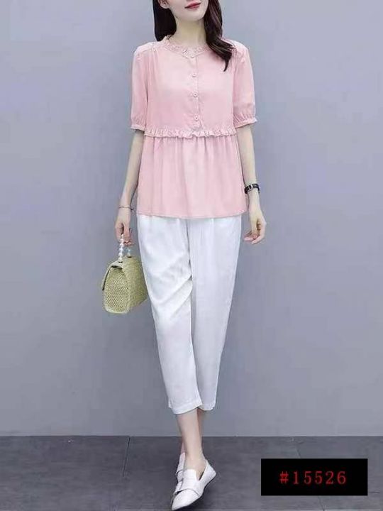 时尚减龄套装338套3.9,荷叶边拼接,纽扣设计,裤子松紧腰,有口袋,码数2...