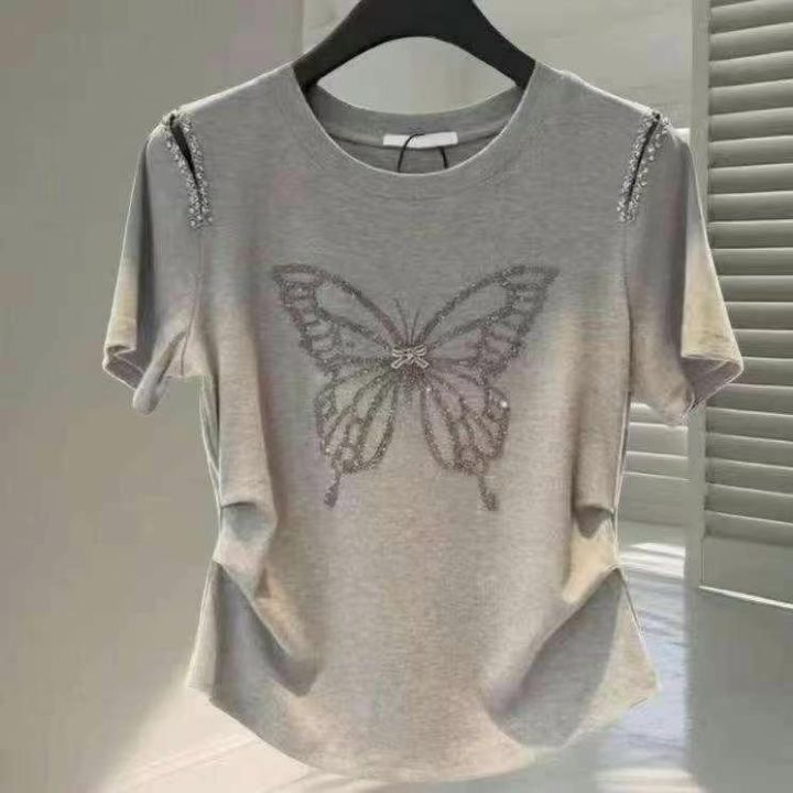 清9.8分货➕1欧货重工轻奢蝴蝶钉珠设计感纯棉短袖上衣夏季爆款气质显瘦T恤...