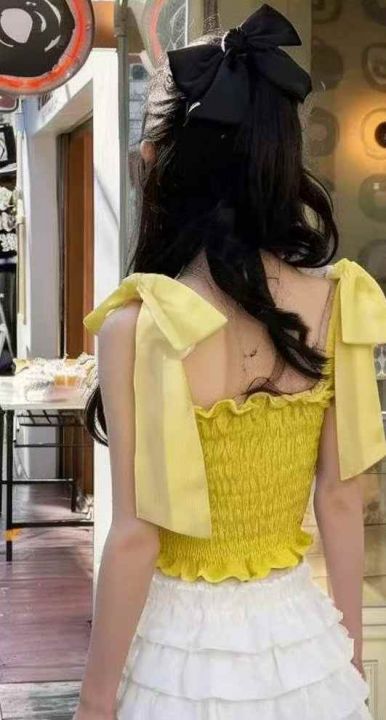 夏季新款纯欲飘带蝴蝶结设计感性感弹力显瘦针织背心,独立包装,均码面料柔...