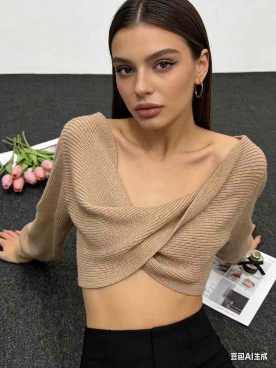 欧美针织V领扭结长袖短款上衣,独立包装,均码,90件左右,全清6.8...