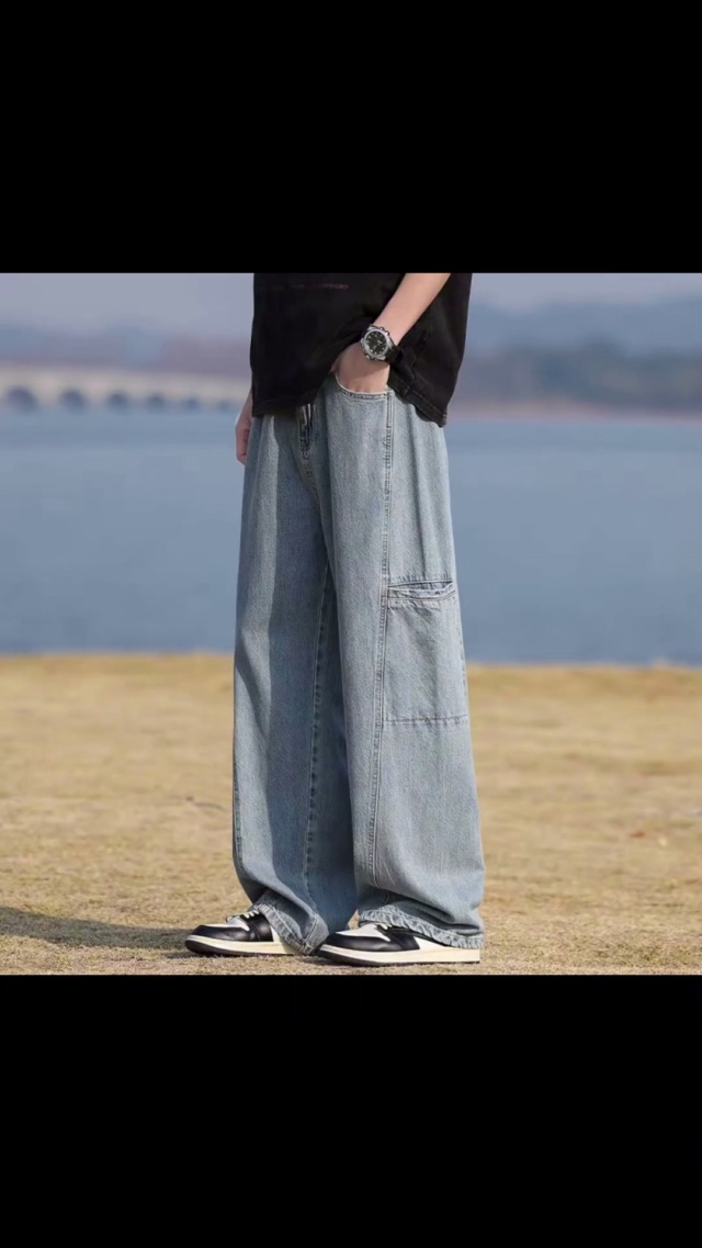 秋冬新款洗水棉网红高街高腰美式复古辣妹直筒黄泥染牛仔阔腿裤,独立包装带...