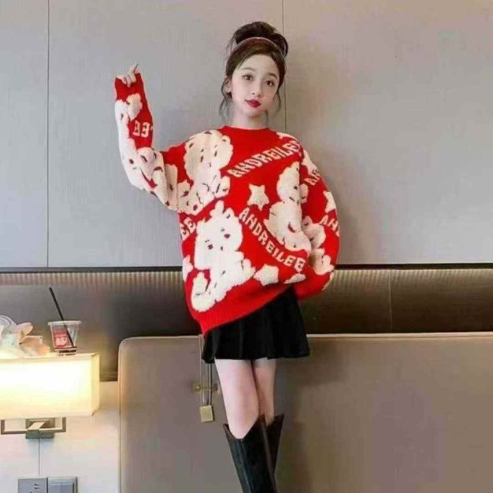 秋冬新款男女童中大童童装复古本命年红色提花包芯纱圆领套头毛衣,独立包装...