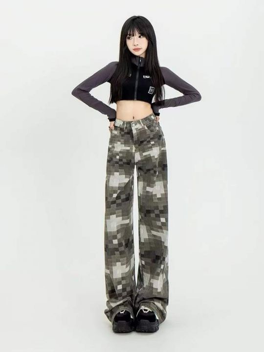 高街迷宫格阔腿牛仔裤女新款显瘦ins潮直筒工装拖地裤369条全清12.8元,码数...