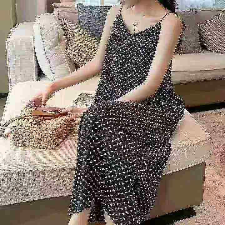 夏季新款高级感黑色波点连衣裙女宽松显瘦无袖气质法式长裙,整款单色,M-L....