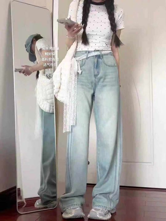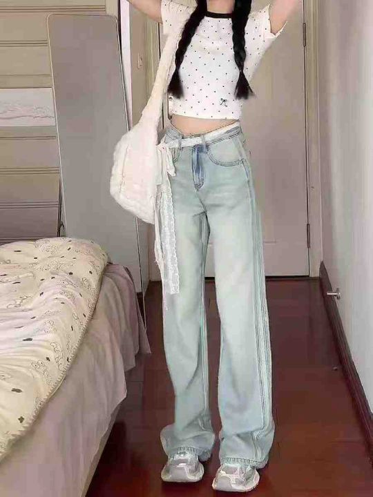 秋季新品洗水棉浅蓝色宽松阔腿高腰显瘦牛仔裤,独立包装带吊牌带防伪扣,码...