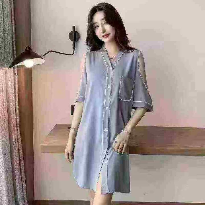 ① 网红冰丝性感露肩韩版宽松家居睡裙!独立包装,整款五色,有部分长袖款...