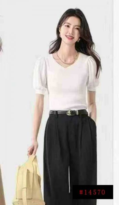 夏季新款法式复古v领雪纺拼接泡泡袖冰丝短袖针织小衫,独立包装,均码面料...