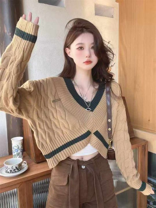 秋冬新款爆款慵懒风加厚麻花宽松短款设计感v领针织套头毛衣,独立包装,均...