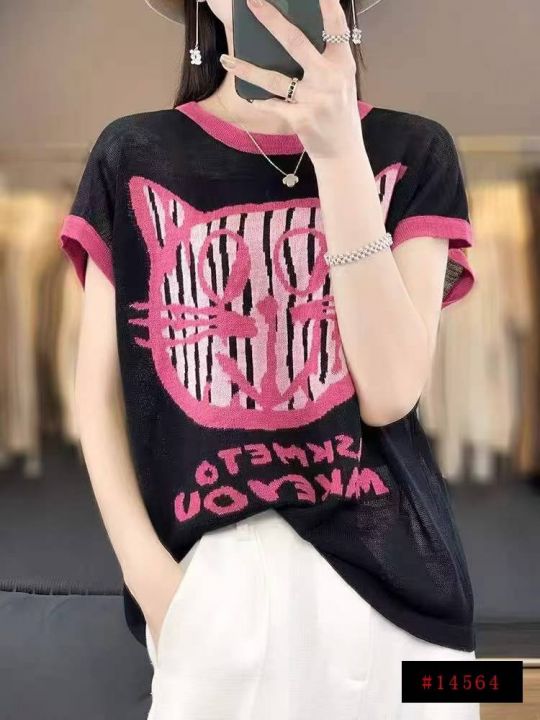 夏季新款时尚设计感拼色猫咪提花宽松慵懒风显瘦落肩针织小衫,独立包装,均...