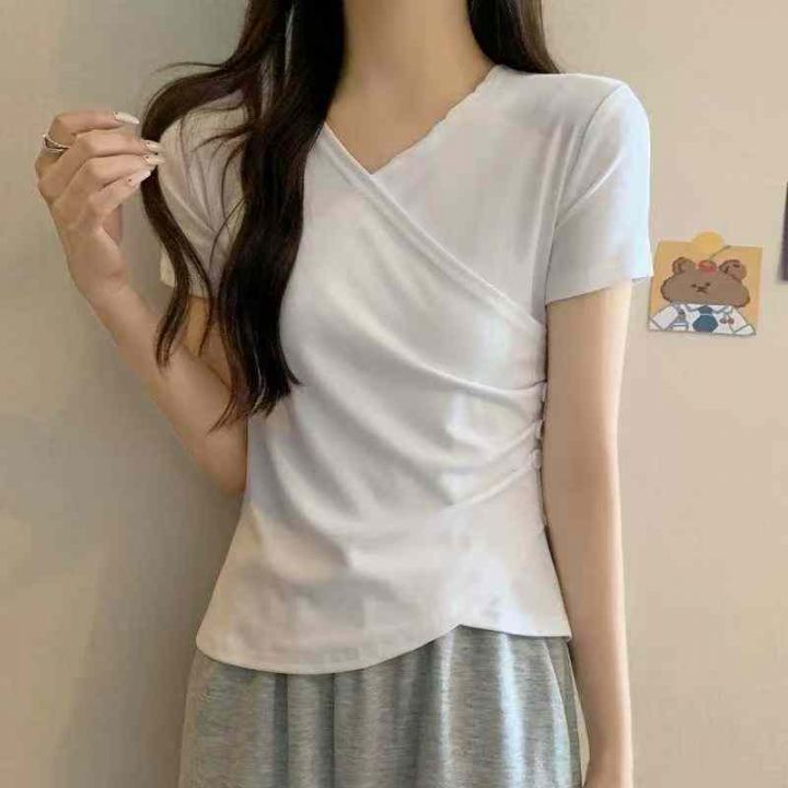 靓妹冰丝短袖236件5.5,面料柔软,高弹力,褶皱收腰,纽扣装饰,不规则设计...