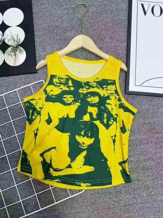 chic辣妹上衣 圆领修身短款复古撞色T恤 Y2K千禧风无袖印花背心夏,独立包装...