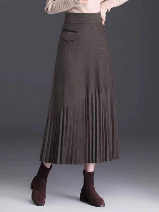 秋冬新款复古高腰褶皱百搭宽松气质针织半身北极绒百褶毛衣长裙,独立包装,...