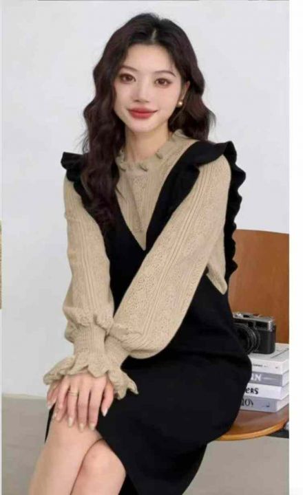 秋冬新款韩系气质荷叶边假2件复古宽松慵懒风针织毛衣连衣裙,独立包装,均...