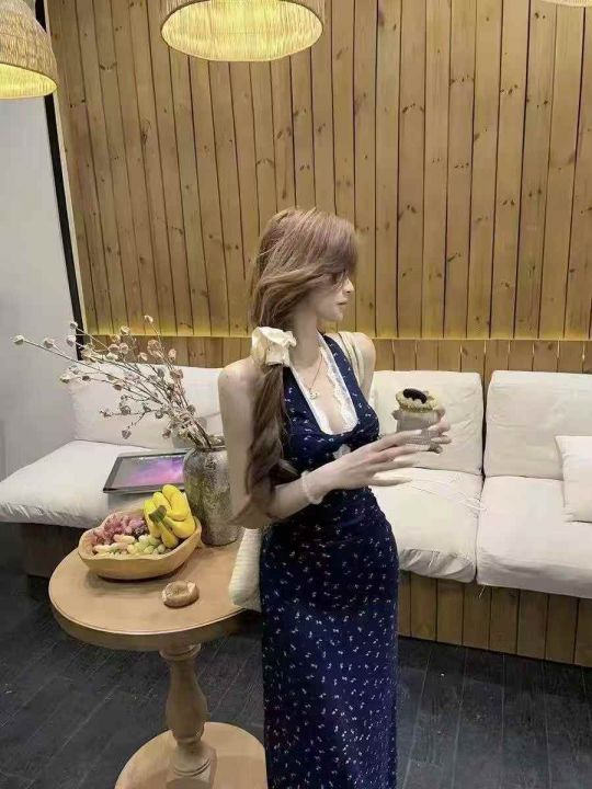 洋气显瘦蓝色挂脖法式碎花连衣裙,单款,高弹力,品质好,拉链式独立包装 ...