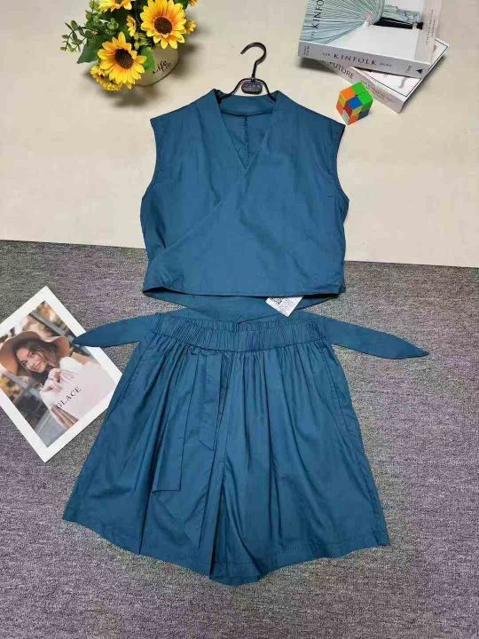 时尚亚麻上衣网红款阔腿短裤两件套,舒适蓝色,单款单色,品质好,有独立包...