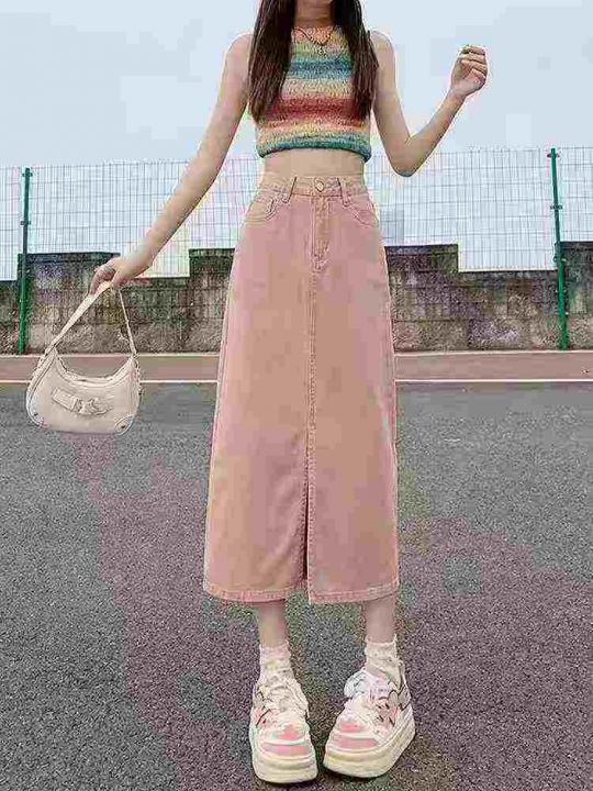 ☕️粉色牛仔长裙半身裙女春秋新款穿搭开叉a字包臀中长裙290条全清11.8元,...