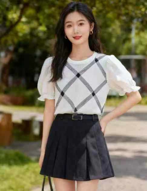 夏季新款雪纺泡泡袖拼接小香风针织短袖T恤,独立包装,均码面料柔软舒适,...