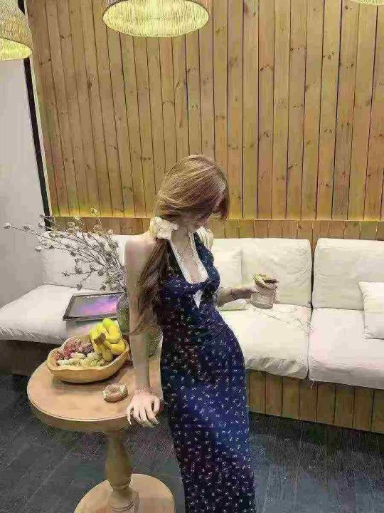 洋气显瘦蓝色挂脖法式碎花连衣裙,单款,高弹力,品质好,拉链式独立包装 ...