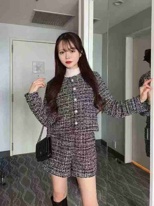 22.8清170套女装小香风外套短裤 两件套 复古圆领长袖格纹小香风粗花呢外套...