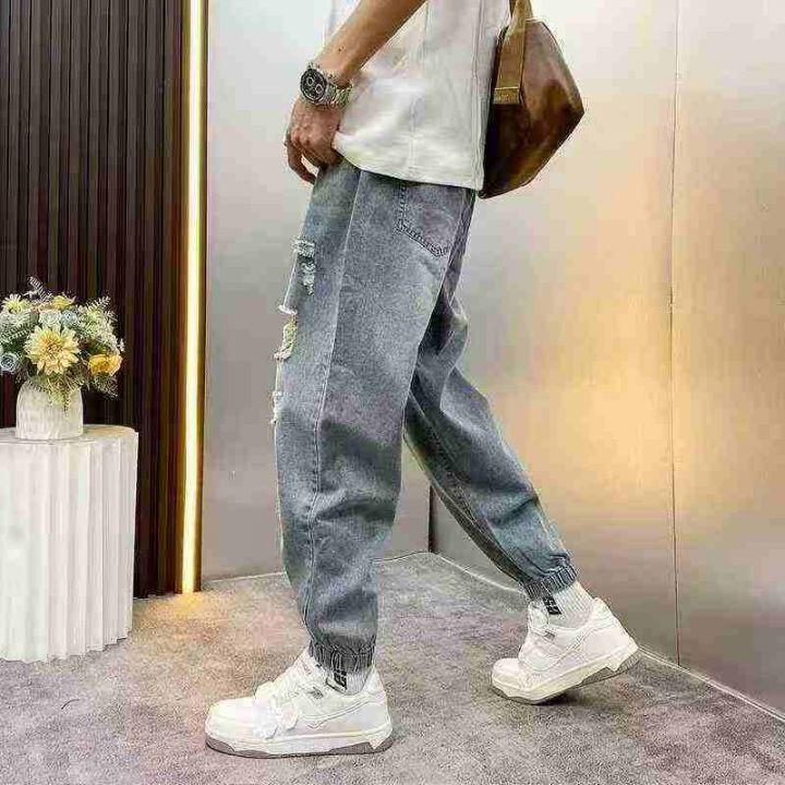 男士破洞牛仔裤2025新款宽松束脚百搭哈伦潮裤100件,独立包装带吊牌,尺码M...