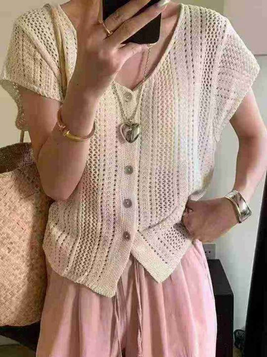夏季新款法式纯色v领宽松镂空设计感单排扣洋气冰丝短袖时尚减龄针织开衫,...