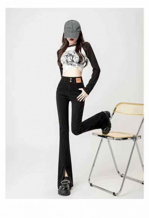 秋季新款高弹力洗水棉开叉高腰显瘦牛仔喇叭裤,独立包装带吊牌,码数XS--2X...
