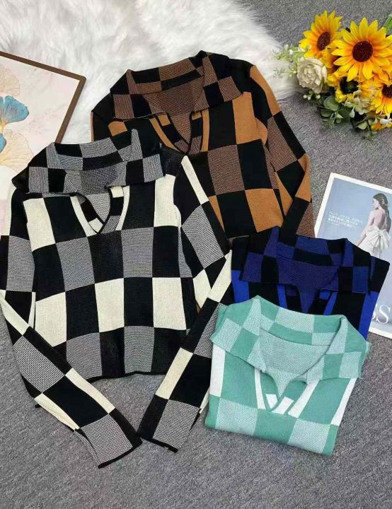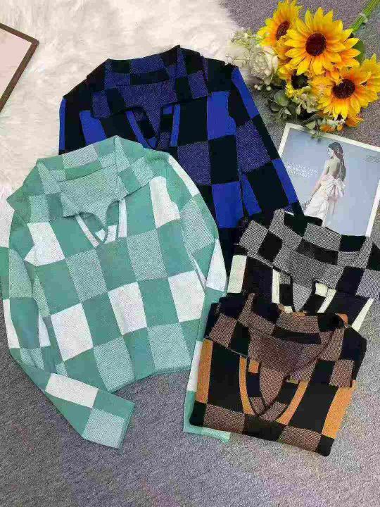春秋新款韩系格纹翻领针织套头毛衣,独立包装,均码面料柔软舒适弹力大,63...