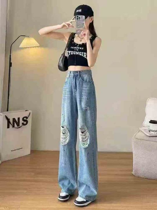 破洞阔腿牛仔裤女夏季新款高腰显瘦宽松直筒裤子221条全清12.8元,码数26-30...