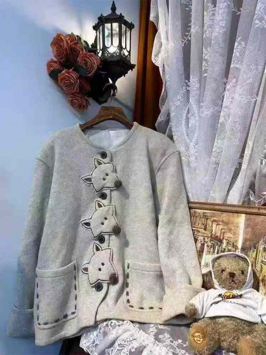 ☕️加厚毛衣开衫外套日系复古小狐狸V领长袖针织开衫女秋冬新款慵懒风宽松...